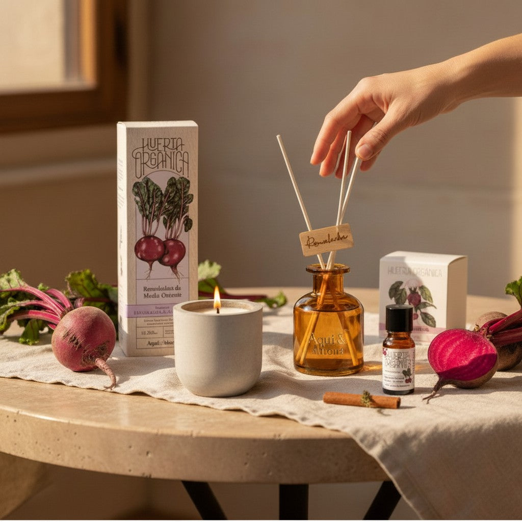 Este pack reúne tres formatos complementarios para ambientar tus espacios durante todo el día: vela aromática, aceite concentrado para hornillo y difusor de varillas, todos con la exclusiva fragancia Remolachas del Medio Oriente.